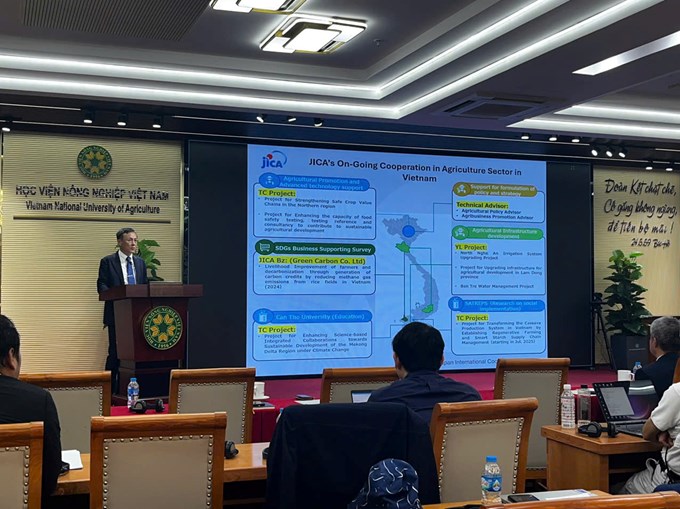 | Ông Miyazoe Mikio -Trưởng Bộ phận Nông nghiệp, Văn phòng JICA Hà Nội phát biểu và giới thiệu về các dự án hợp tác nghiên cứu thuộc lĩnh vực nông nghiệp tại Việt Nam |